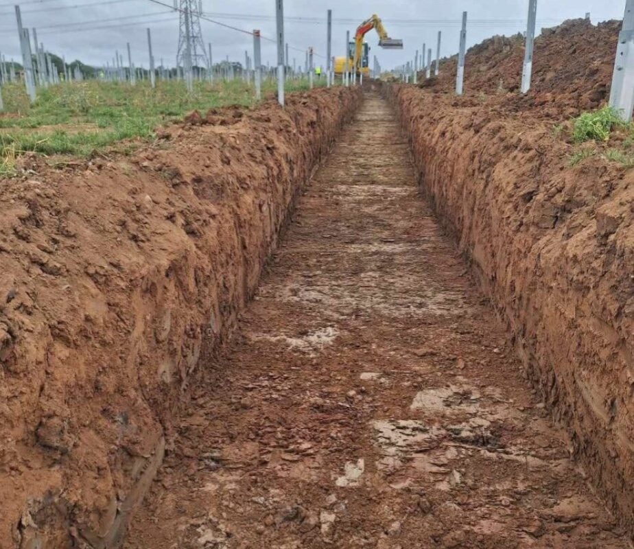 Piling is the noisiest part of construction, and we are just about there now. One team is preparing the ground for cabling and you can see one of our trenches here. These are filled with a layer of sand before protective ducting is laid for the cables. This is then buried with more sand and backfilled