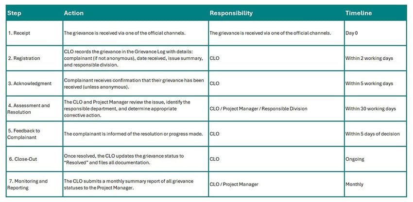 The grievance mechanism will be reviewed regularly to ensure its effectiveness, accessibility, and responsiveness. Feedback from stakeholders will be used to make improvements.